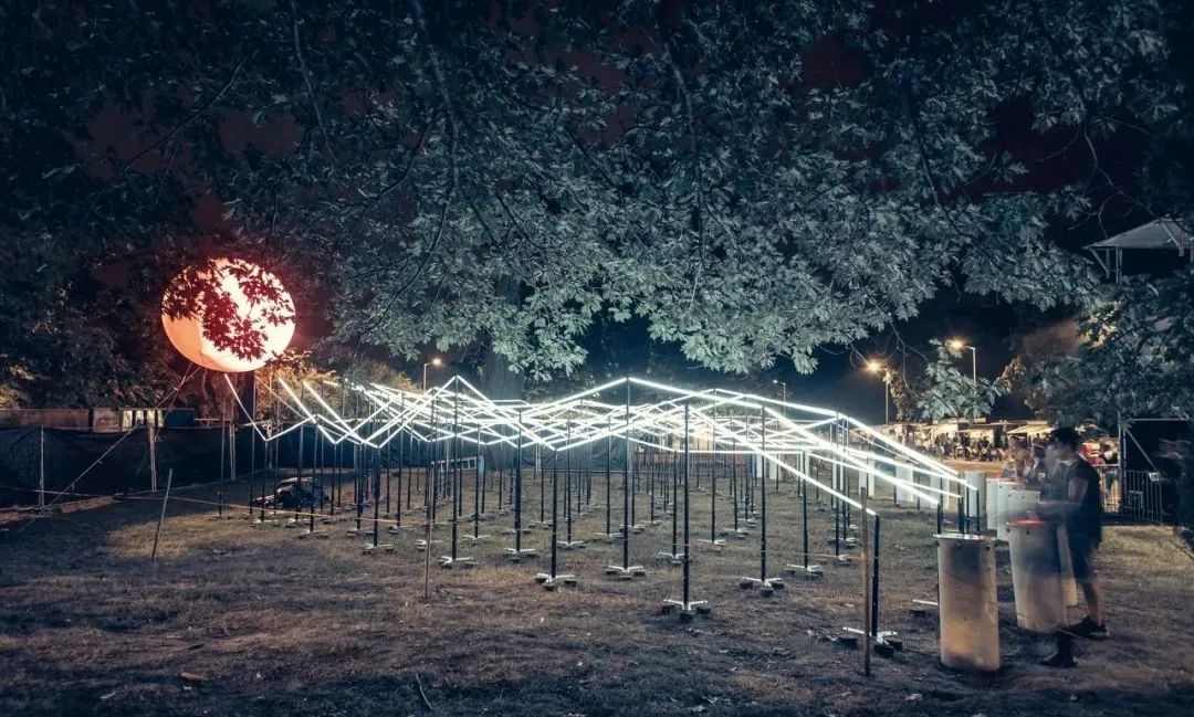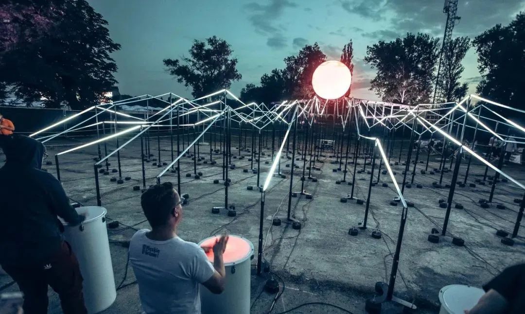 “光波鼓”占地面積約300平方米:包含15個安裝LED控制器的PVC鼓,以及中心處一個直徑約3米的氦氣球,鼓和球之間由200米的傳感LED燈帶連接。為了增強燈帶的視覺效果,燈帶被架設(shè)出山巒般高低起伏的效果。